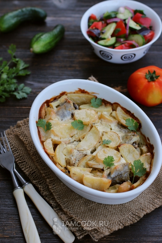 Подаем запеченную навагу с картошкой сразу горячей на стол. Не забудем про овощной салат, он здесь будет очень уместен.
