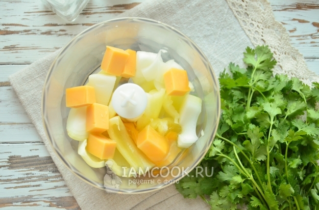 Удобно измельчать сыр, сладкий перец и лук с помощью блендера. Сыр нарежьте небольшими кубиками. Сладкий перец нарежьте также на небольшие кусочки, удалив сначала плодоножку и семена. Половинку луковицы разрежьте на 3-4 части.
