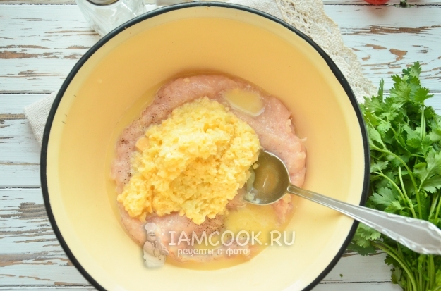В миску с фаршем переложите ароматную массу из сыра, лука, перца и яйца.