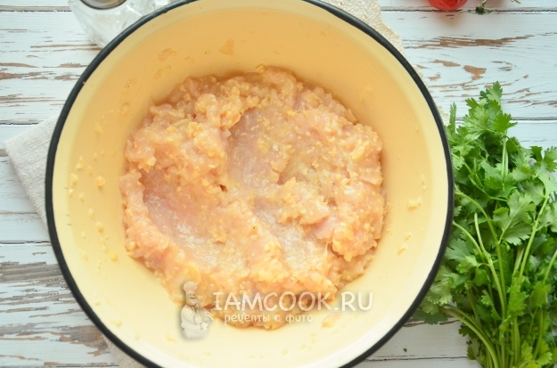 Куриный фарш переложите в миску и добавьте к нему соль, черный молотый перец.
