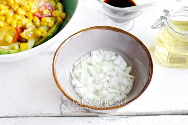 Маринуйте лук 5 минут, затем ломтики отожмите от маринада, закиньте к основному составу.