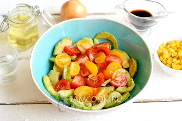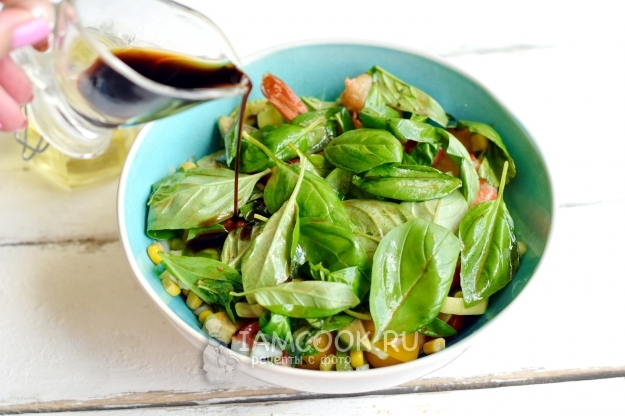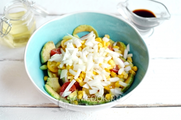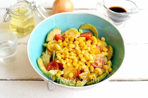 Консервированную кукурузу откиньте на дуршлаг, ополосните, чтобы избавить ее от клейкого маринада, затем добавьте в салат.