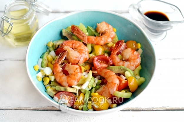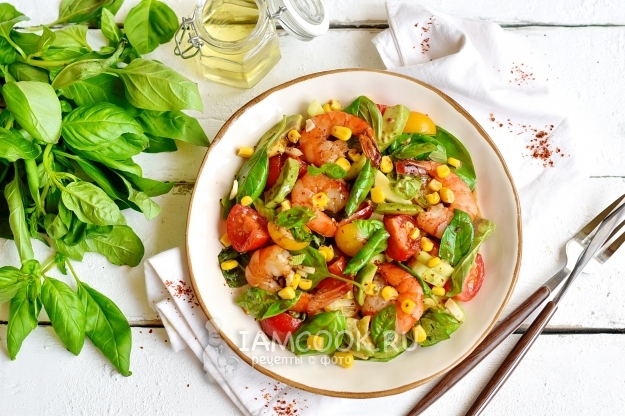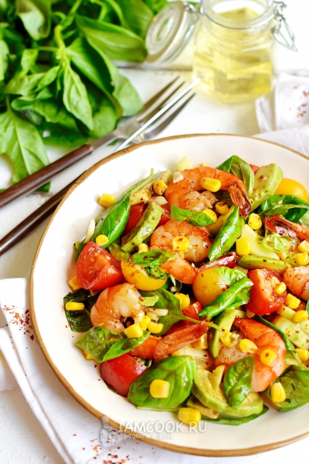 Салат с жареными креветками готов. Подавайте на стол сразу после приготовления.