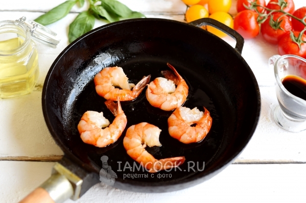 На плиту установите сковороду, ее поверхность смажьте маслом в объеме 1 ст.л. В горячее масло опустите сырых креветок. Жарьте их на сильном огне по 1,5 минуты с каждой стороны, присыпьте солью. Во время жарки креветки моментально поменяют свой цвет, станут ярко-оранжевыми.