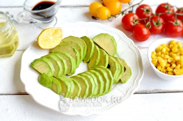 С авокадо снимите верхний слой, разрежьте его на две продольные половинки, удалите крупную кость. Мякоть разрежьте поперек на дольки одинакового размера. При нарезке авокадо быстро темнеет. Чтобы этот процесс происходил медленнее, кусочки сбрызните соком лимона.