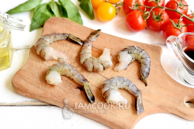 Креветок очистите от верхнего панциря. Процесс совершайте очень аккуратно, чтобы не повредить целостность мяса внутри. При желании оставьте твердый хвост, так креветки будут интереснее смотреться в салате.