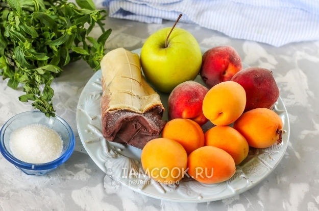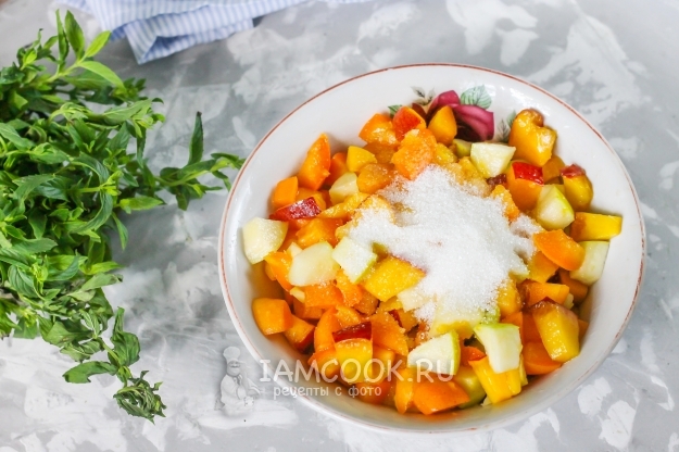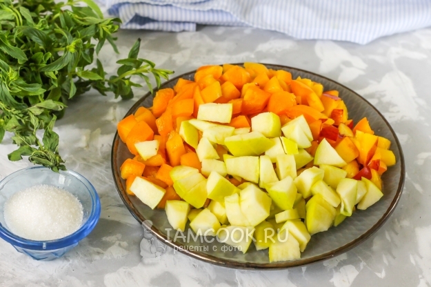Промойте абрикосы, персики и яблоки в воде, располовиньте. Из абрикосов и персиков удалите косточки, нарежьте их кубиками. Из яблока вырежьте семенные блоки и также нарежьте кубиками.
