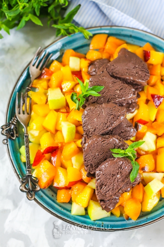 Выложите фруктовую массу на тарелку, в пиалу или на блюдо. Нарежьте мороженое кружочками и добавьте на блюдо. Украсьте фруктовый салат с мороженым по вкусу и сразу подайте.