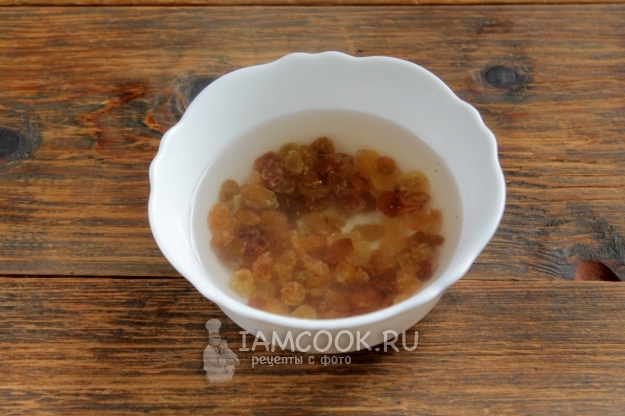 Изюм примерно 5-10 минут пропариваем в кипятке — разбухший изюм в вафлях не только чище, но и вкуснее.