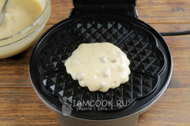 Выкладываем по 2 ст.л. теста с изюмом по центру раскаленной вафельницы, закрываем и печем около минуты. Если хотите получить сухие вафли, остужайте отдельно друг от друга, в подвешенном виде — удобно на чашке/банке.