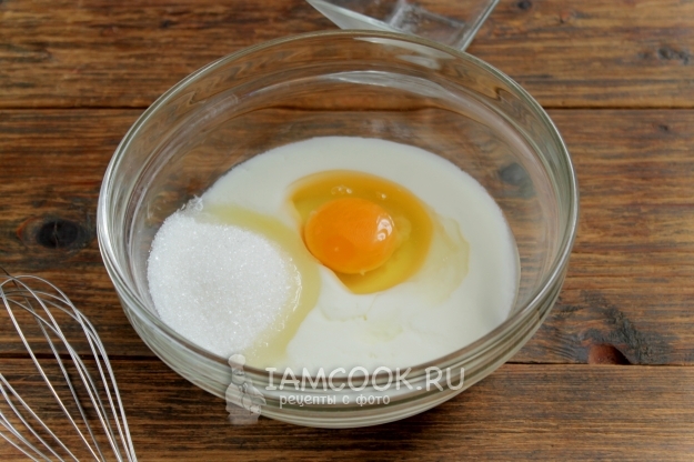 Взбиваем кефир, сахар и яйцо — до однородности.