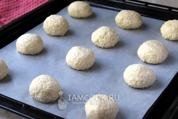 После чего сформируем 12 круглых заготовок размером чуть больше грецкого ореха и выложим их на противень, застеленный пергаментом.