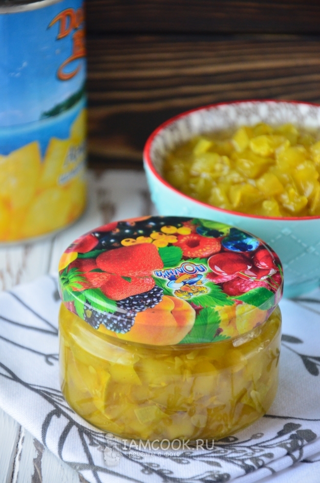 С помощью консервного ножа откройте баночку с консервированными ананасами. Обычно я использую те ананасы, которые есть под рукой - нарезанные кольцами или кусочками, ведь нужен только сироп. Ананасы без сиропа затем желательно использовать в течение нескольких дней - можно положить в салаты, в пиццу или закуски, десерты.