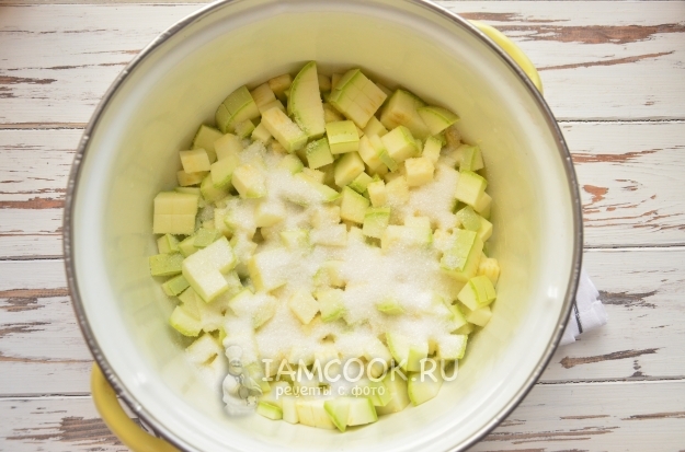 Сложите кубики кабачков в кастрюлю с толстым дном или в сотейник. Засыпьте сахаром.