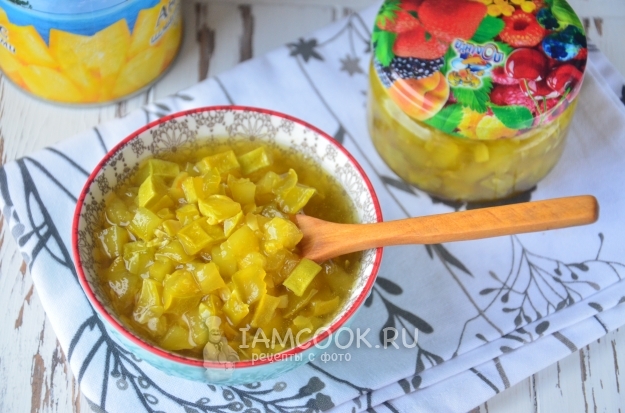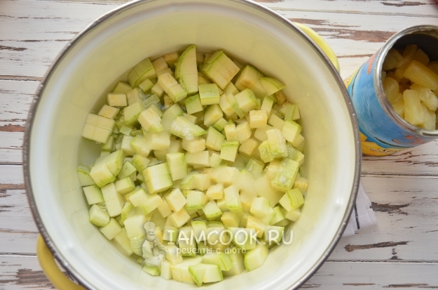 Влейте в кастрюлю ананасовый сироп, все размешайте и поставьте на плиту. Варите варенье в течение часа на слабом огне, помешивая периодически. Следите, чтобы сироп и кусочки овощей не пригорели.