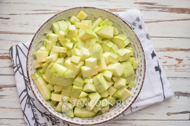 Кабачок лучше использовать молодой, а если он более зрелый и кожура не слишком мягкая - ее лучше срезать. Также обрежьте плодоножку и нарежьте мякоть кубиками. Жесткие семечки также лучше вырезать.