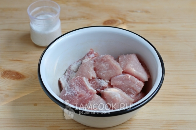Сложим кусочки мяса в миску, посолим и перемешаем.