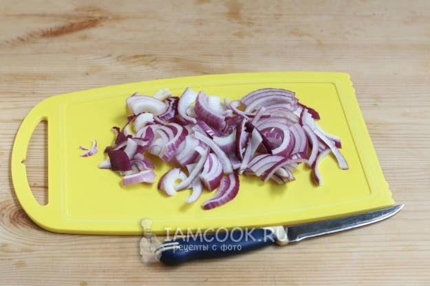 Пока жарится мясо, быстро нарежем полукольцами лук.