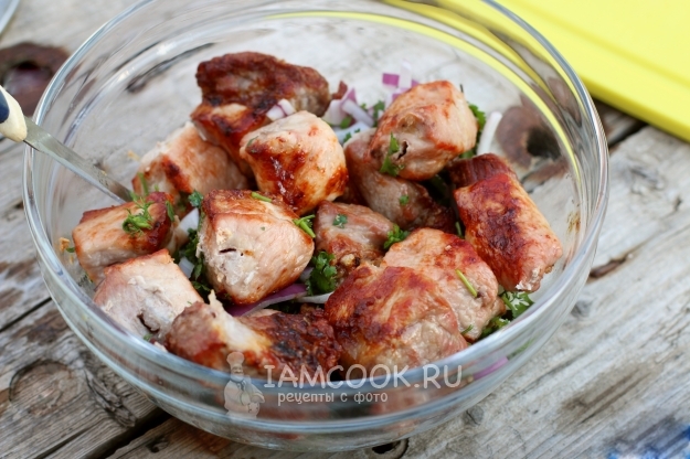 Готовый шашлык снимаем с шампуров прямо в миску с луком и зеленью. Накрываем крышкой и дадим 5 минут пропитаться ароматами свежей зелени и лука.