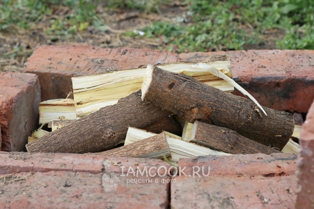 Так как свинину мариновать не нужно, в первую очередь разведем огонь в мангале и дождемся, пока дрова сгорят и останутся хорошо тлеющие угли.