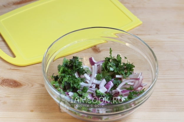Нарежем кинзу с базиликом и смешаем с луком в миске.