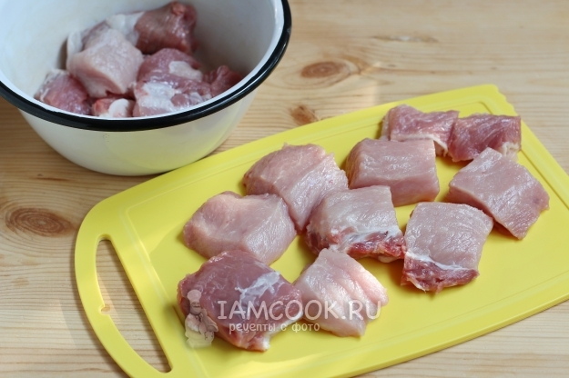 Когда мангал будет практически готов, нарежем кусочками свинину.