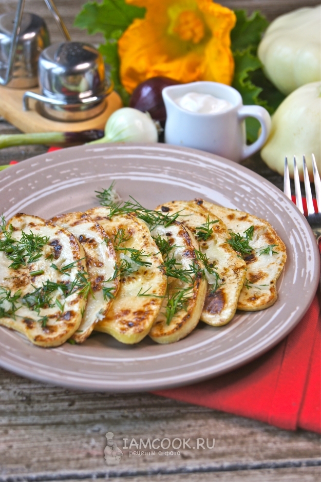 На моем дачном участке во всю растут разные овощи, среди них - вкусные, нежные и мясистые патиссоны, они неприхотливые и прекрасно приживаются в любых условиях. Сколько же разных блюд я с ними уже сделала... Надеюсь, еще месяц будут расти и я еще много чего приготовлю из этого вкусного овоща. Больше всего люблю фаршировать патиссоны, их необычная форма идеально подходит для этого. Но не менее вкусно просто пожарить патиссоны на растительном масле, присыпать рубленым укропчиком и чесночком, да подать со сметаной, ох и вкусно же... Именно этим рецептом я хочу поделиться с вами.