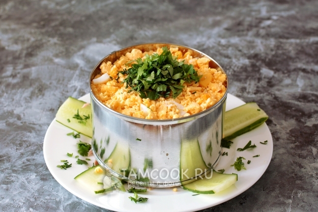 Заключительный слой - желток. Украсьте зеленью и осторожно снимите сервировочное кольцо.