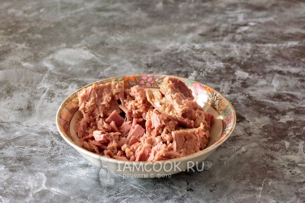 Масло от тунца вылейте в отдельную емкость, его нужно добавлять в салат по необходимости. Если есть желание, то замените масло на майонез. Тунца измельчите вилкой до однородной массы, если он единым кусочком, как у меня. Этот кусочек я бы съела и без салата))))