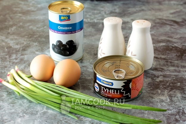 Подготовьте все необходимые продукты для приготовления слоеного салата с консервированным тунцом. Яйца заранее отварите вкрутую.