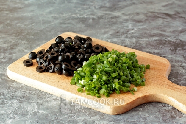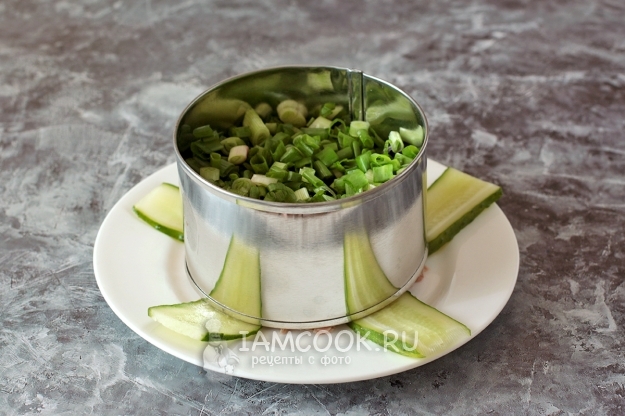 На дно сервировочного кольца выложите слой тунца, поверх - оливки, затем - зеленый лук. Полейте немного маслом.