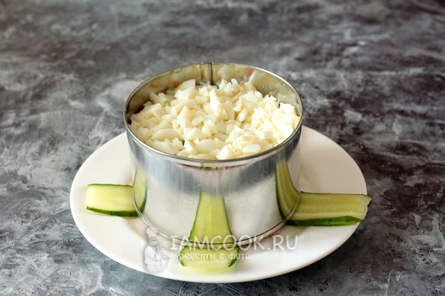 Затем выложите еще один слой тунца и белок яиц. Масло добавляйте по необходимости. Если решите заменить его майонезом, то промазывайте ингредиенты через слой.
