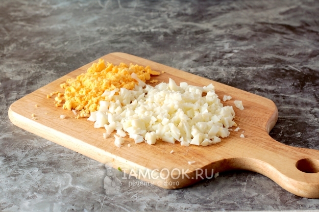 Вареные яйца очистите, отделите белок от желтка и измельчите по отдельности.