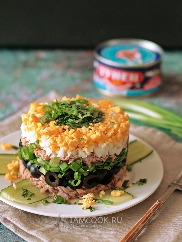Слоеный салат с тунцом не содержит в себе редких ингредиентов, даже оливки можно заменить маринованными огурчиками, если уж вы сильно против них. Я все-таки предлагаю попробовать салат в моем варианте и без замен. По поводу консервы... Знаете, в магазинах везде продают тунца для салатов, там такая гомогенная масса внутри, мало похожая на рыбу. Я его никогда не покупаю именно из-за структуры, а тут как раз тот случай, когда подойдет такая масса, даже измельчать ничего не нужно будет.
