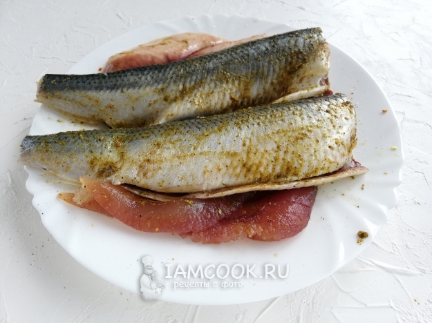 Натираем сельдь солью, перцем и любыми специями. Не забываем то же самое сделать с икрой и молоками.