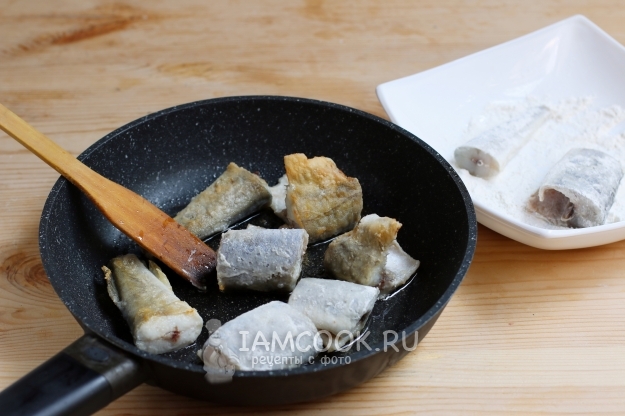 Обваливаем кусочки наваги в муке и слегка обжариваем их в растительном масле со всех сторон.