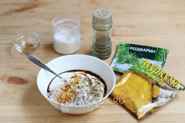 Для сметанного соуса смешаем сметану, соевый соус, розмарин, куркуму, молотый перец и немного соли. Так как сметана у меня 25% жирности, я добавила еще немного водички на глаз, чтобы соус получился более текучим.