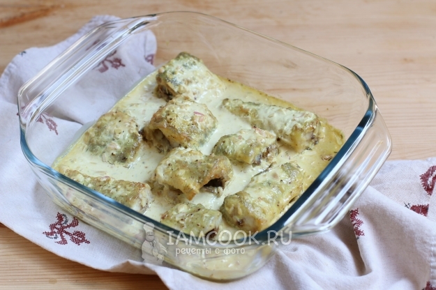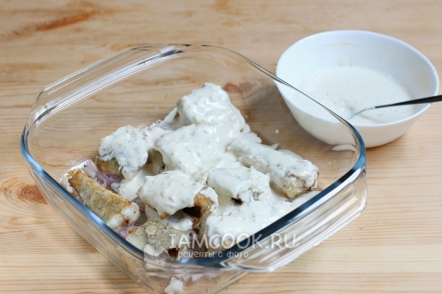 На лук укладываем кусочки рыбы, посолим их немного и зальем сметанным соусом. Отправляем форму с рыбой в разогретую заранее духовку и выпекаем минут 20-25.