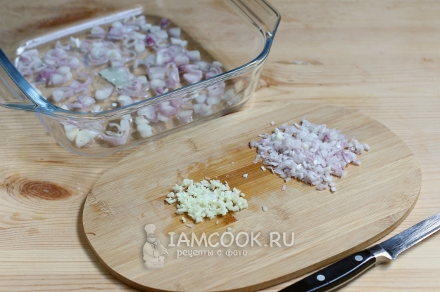 Часть лука нарежем полукольцами и уложим в форму, смазанную растительным маслом. А вторую часть лука нарежем очень мелко, также измельчим чеснок, их мы потом будем добавлять в сметанный соус. Лук и чеснок сделают сметанный соус невероятно ароматным, а все блюдо - аппетитным.