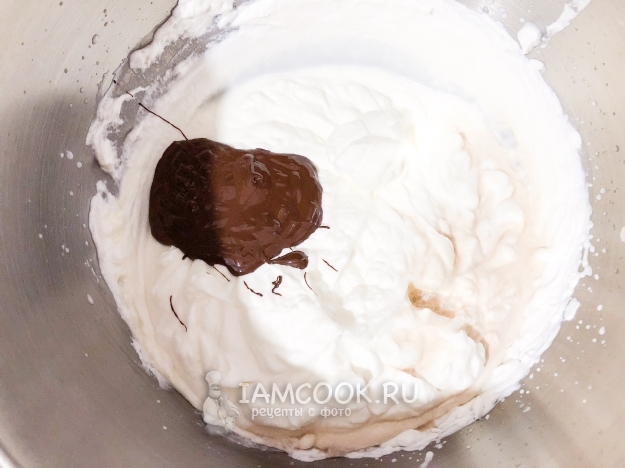 Добавьте шоколад и кофе к сливочной массе и взбейте до однородной консистенции.