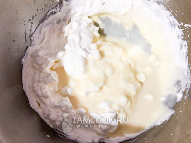 Добавьте сгущенное молоко и добейтесь однородной консистенции, взбивая миксером на средней скорости.