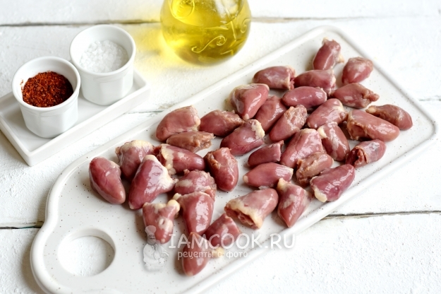 Сердечки отделите от тонкой пленки сверху, срежьте сбоку участи жира.