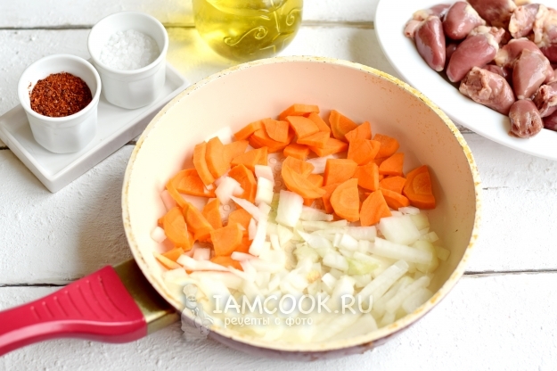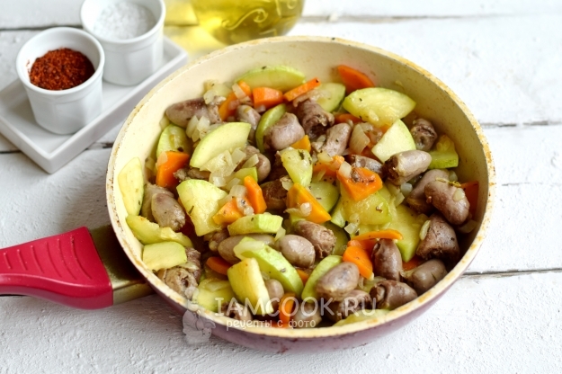 Сердечки ополосните, дайте стечь влаге, затем поместите их в сковороду к пассерованным овощам. Жарьте смесь 5 минут, иногда перемешивайте. Огонь снизьте до среднего, чтобы овощи не пригорели.