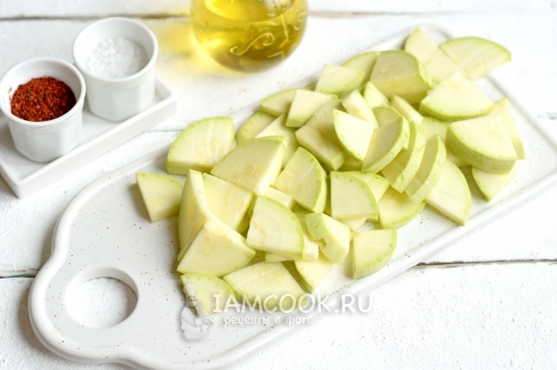 Кабачок разрежьте на 4 продольные части, после настрогайте их пластинами средней толщины.