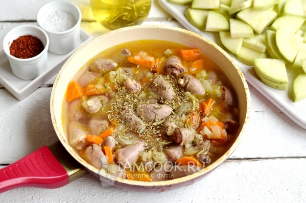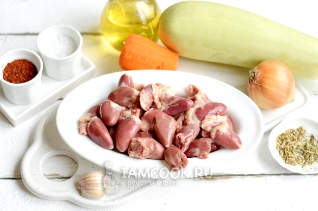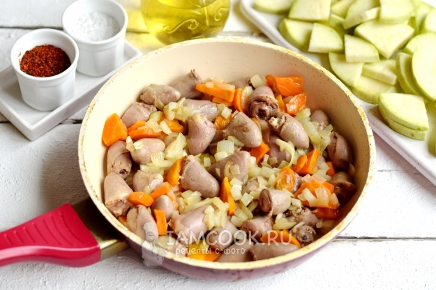 Кабачок — овощ с нейтральным, не ярко выраженным вкусом, поэтому легко приспосабливается к любым компонентам в различных блюдах. Сегодня готовим куриные сердечки с кабачками. Именно кабачок делает блюдо сочным, ароматным, вкусным, а также полезным. Сначала сердечки тушим в сковороде с морковью и луком, кабачок добавляется не сразу, иначе в период долгой термообработки кусочки превратятся в кашицу.