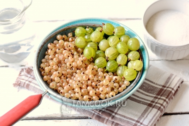 Ягоды поместите в прохладную воду, чтобы на поверхность всплыл весь мусор, грязную воду сливайте несколько раз. Ягодки смородины отделите от веточек, уложите в дуршлаг, туда же поместите крыжовник. Плоды обдайте проточной водой, дайте стечь всей жидкости.