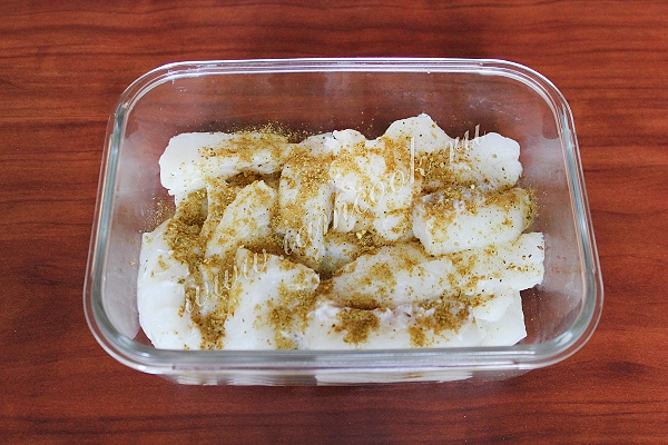 Филе камбалы нарежьте на продолговатые кусочки и припудрите специями.