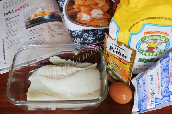 Для приготовления камбалы в кляре подготовьте: филе камбалы, муку, крахмал, яйцо, воду или пиво, специи, соль и растительное масло для фритюра.