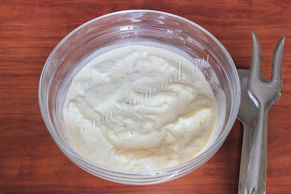 Мне нравится такой вариант обмакивания рыбы в кляр: поместить в него все кусочки рыбы сразу,