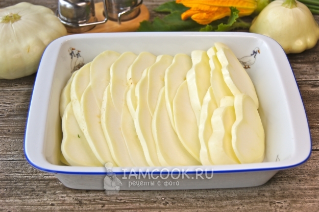 Вымоем и нарежем патиссоны, как больше нравится, но не очень крупно. Выложим в огнеупорное блюдо.